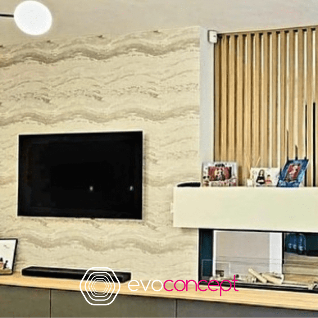 Am propus un tapet cu model ondulat, inspirat din structurile naturale ale pietrei, în nuanțe calde, neutre, care se integrează perfect cu mobilierul și elementele de lemn decorativ.